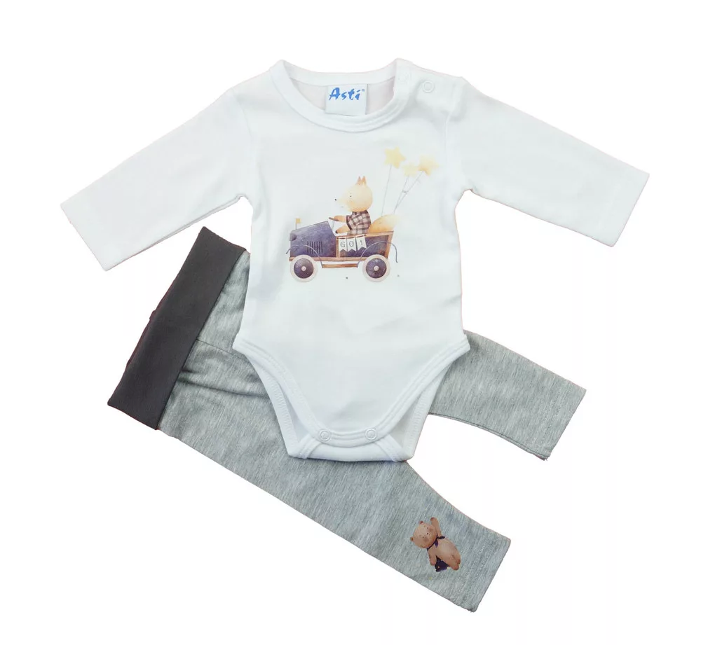 Varázsolja vidámmá a mindennapokat ezzel a bájos 2 részes baba szettel, amelyet aranyos állatos minta díszít. A praktikus és kényelmes összeállítás minden kisbaba ruhatárának kedvenc darabja lesz – akár otthon, akár sétához vagy látogatáshoz.