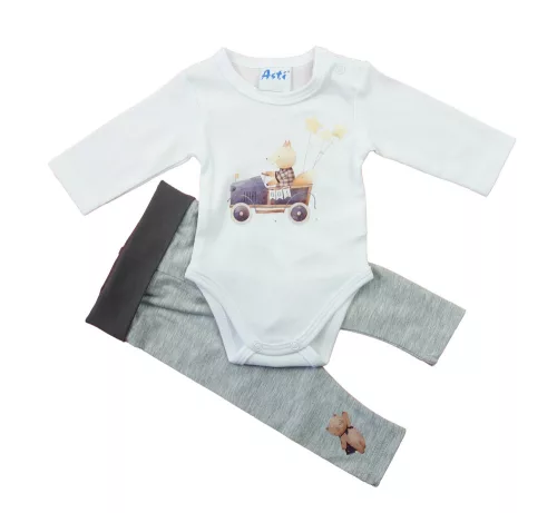 Varázsolja vidámmá a mindennapokat ezzel a bájos 2 részes baba szettel, amelyet aranyos állatos minta díszít. A praktikus és kényelmes összeállítás minden kisbaba ruhatárának kedvenc darabja lesz – akár otthon, akár sétához vagy látogatáshoz.