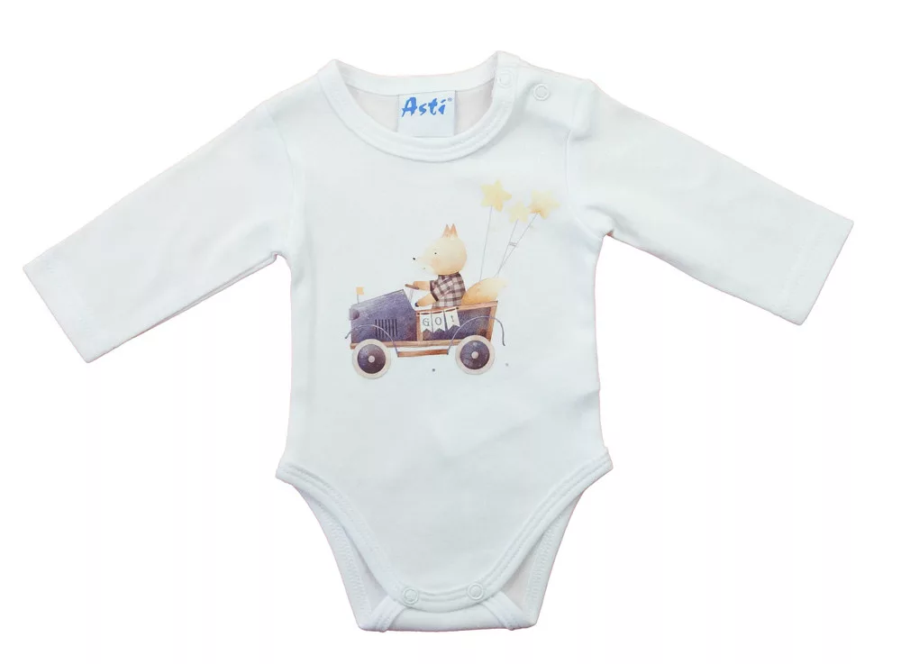 Fehér, állatos mintás body – vállon patentos, könnyen feladható, 100% pamut anyagból készült, amely kíméletes a baba bőréhez.