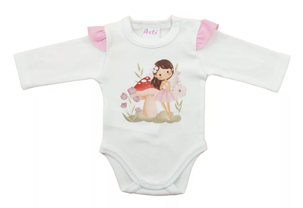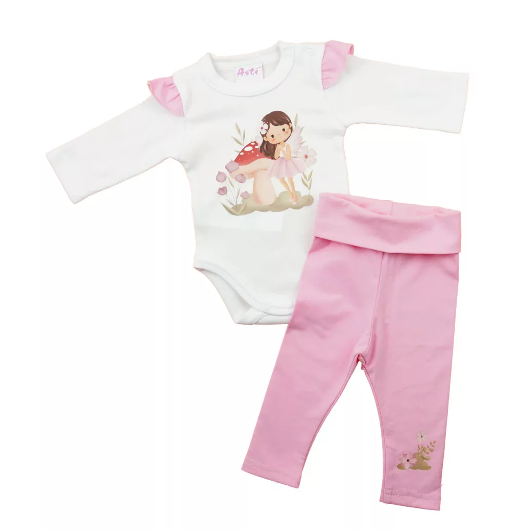 A szett tartalmaz egy hosszú ujjú, fodros, vállon patentos bodyt és egy puha baba nadrágot. A body 100% pamutból készült, míg a nadrág rugalmas, 95% pamut – 5% lycra anyagának köszönhetően biztosítja a szabad mozgást és a kényelmet.