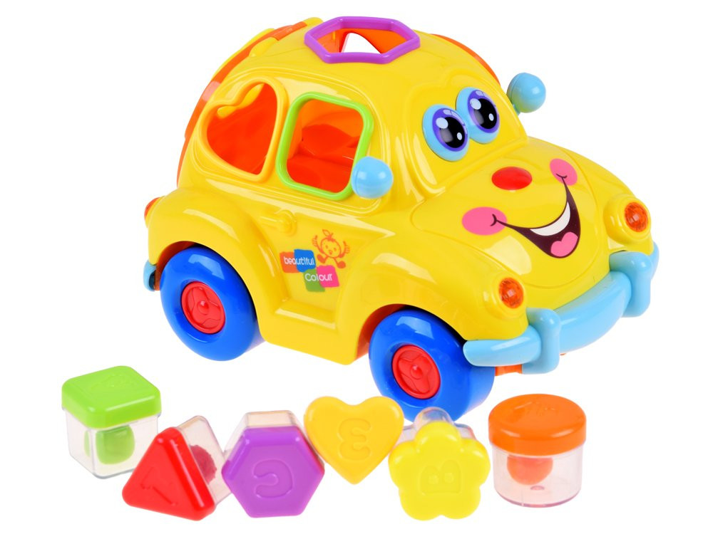 Az autóban 6 különálló elem van, háromszög, négyzet és kör, szív, ötszög, virág alakjában. A gyermek feladata, hogy a megfelelő figurát hozzáigazítsa az autó megfelelő lyukához. Az autó belsejébe dobott elemek eltávolításához nyissa ki az autó csomagtartóját.