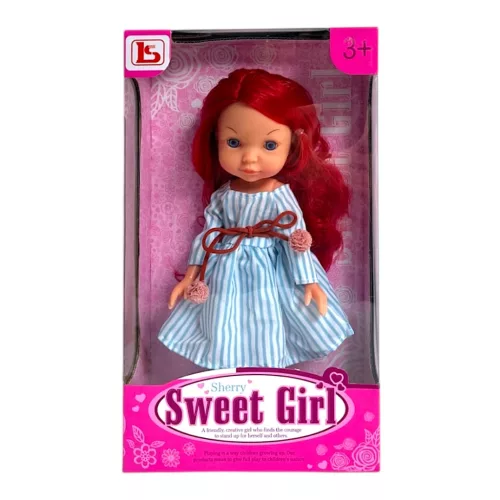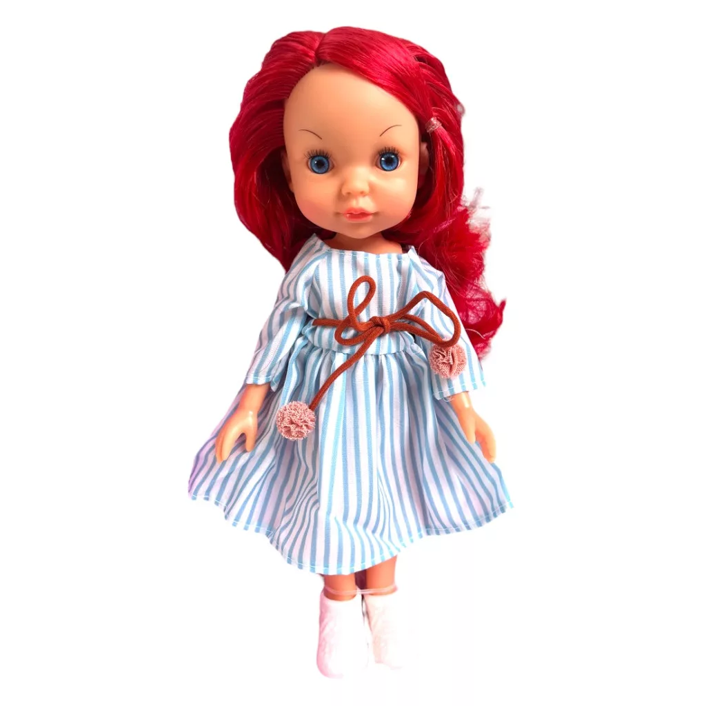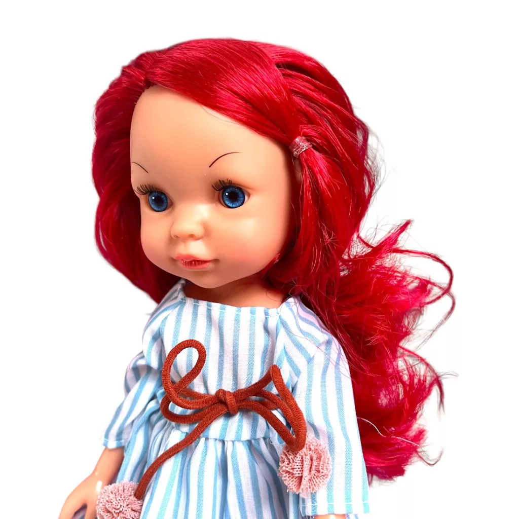 Baba, hagyományos, hajas, üvegszemű, 25 cm, 16x28 cm dob.