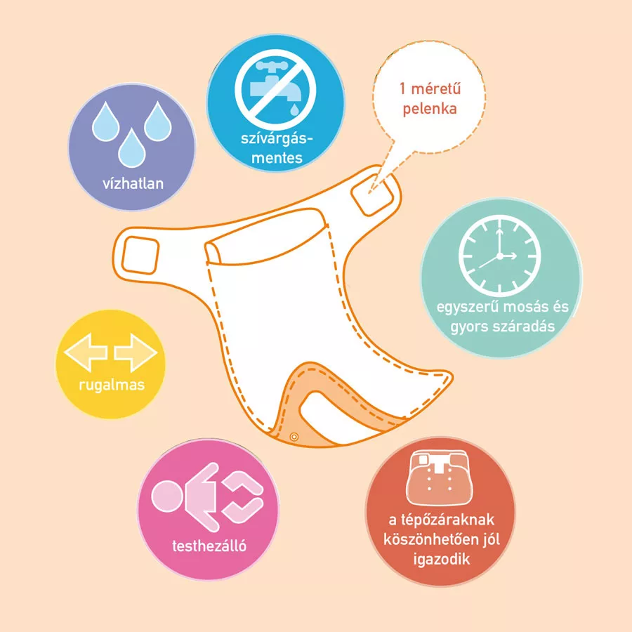 Mosógépben mosható maximum 60°C-on. A pelenka maximális élettartamának megőrzéséhez ajánljuk a 40°C-on való mosást. Ne használjon klór tartalmú fehérítőt. Szárítógépben alacsony hőfokon szárítható. Tilos vasalni. A tépőzáras füleket mindig össze kell zárni mosás előtt, hogy meggátoljuk a pelenkák kirojtozódását.