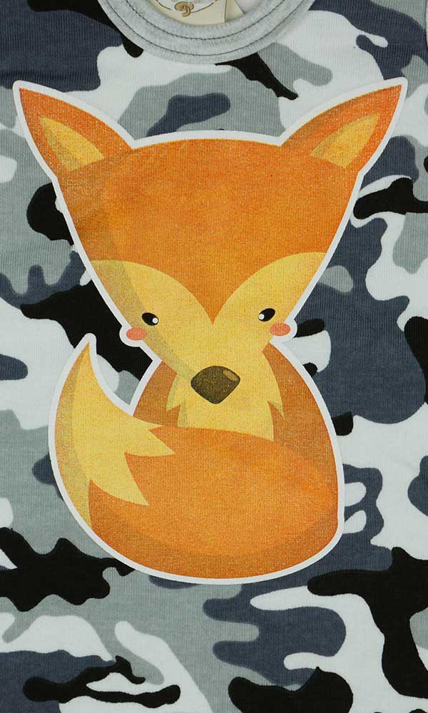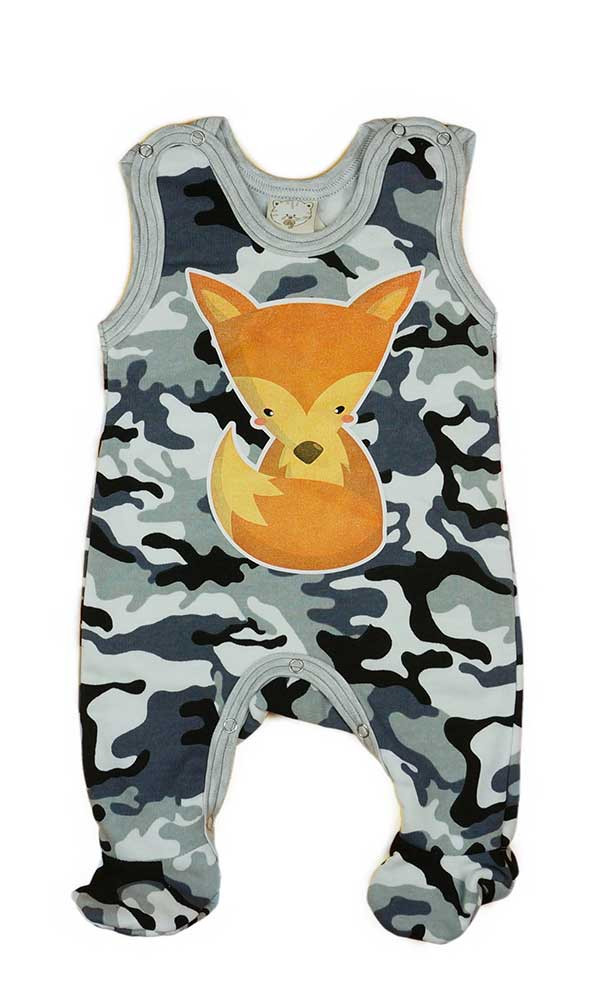 Terepmintás, vállon patentos, ujjatlan baba rugdalózó róka mintával.