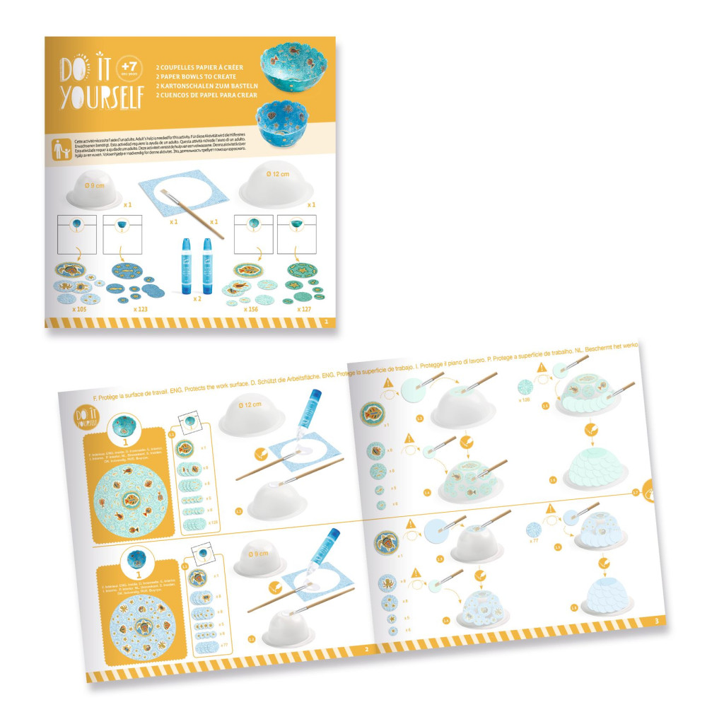Teljes kreatív készlet két dekoratív papírtálka készítéséhez, csupán papír és ragasztó felhasználásával. A gyermek egyszerűen ragassza a nagy konfettidarabokat a formákhoz a folyékony ragasztóval, először a tál belsejére, majd a külső oldalára, hagyja megszáradni, majd vegye ki a formából. A  (képes) használati útmutató részletes segítséget ad a tálkák elkészítésében.