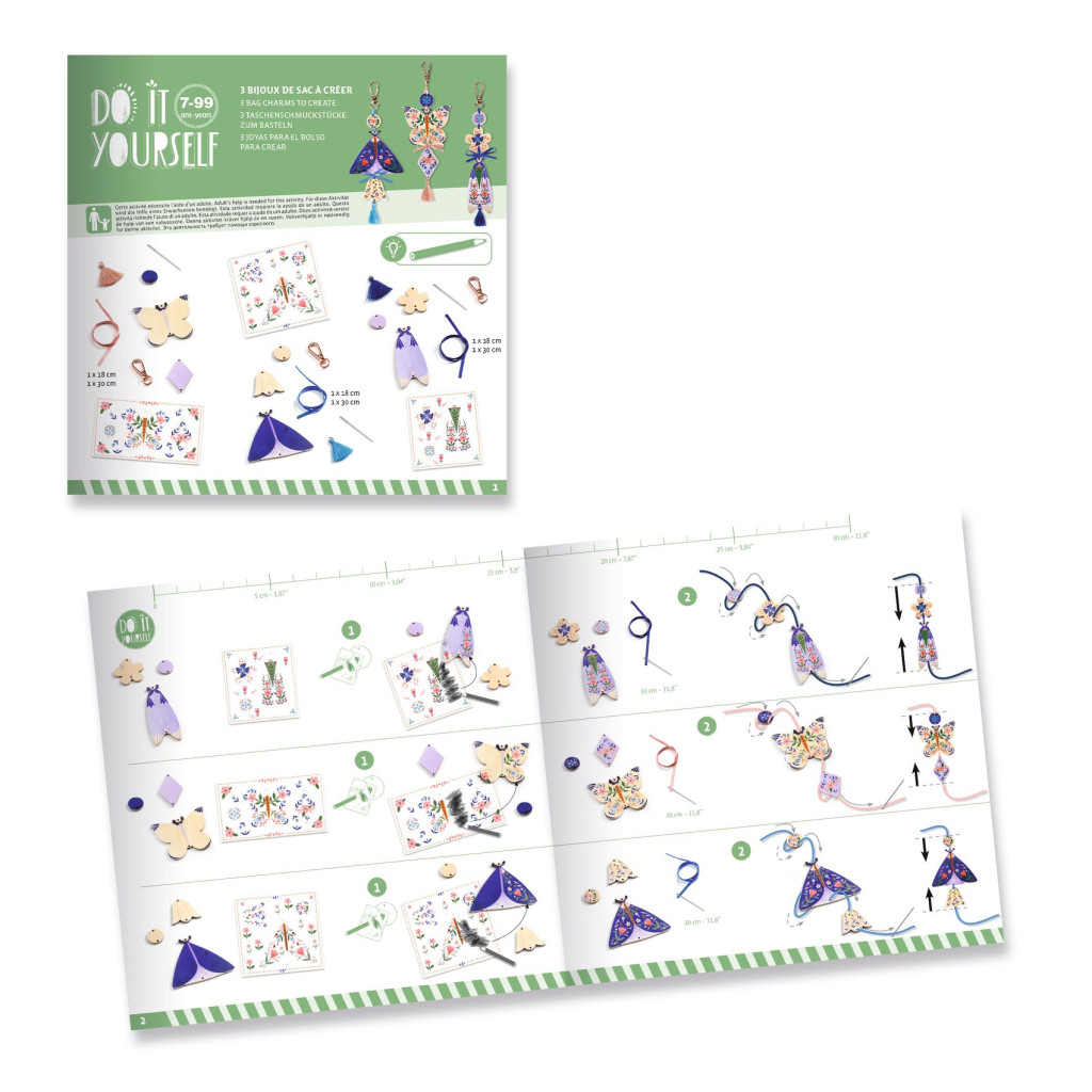 Három különleges díszt lehet készíteni több mint 100 matricával és kiegészítővel. A befejezés után ez a tökéletes dekoráció a táskához vagy a kulcstartóhoz.