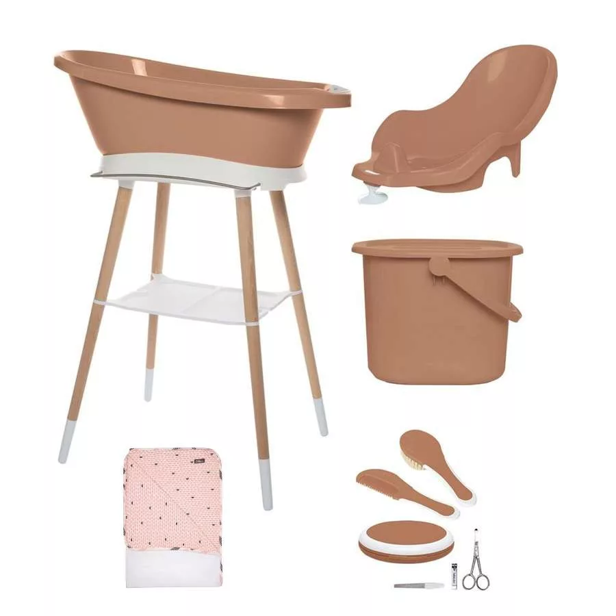 A készlet tartalma: a Sense digitális fürdőkád és egy lakkozott bükkfa állvány, egy pelenkázó vödör, fürdető ülőke, egy manikűrkészlet, egy hajkefe és egy fésű, illetve egy törölköző. Röviden:Egy egész készlet a baba fürdetéséhez.