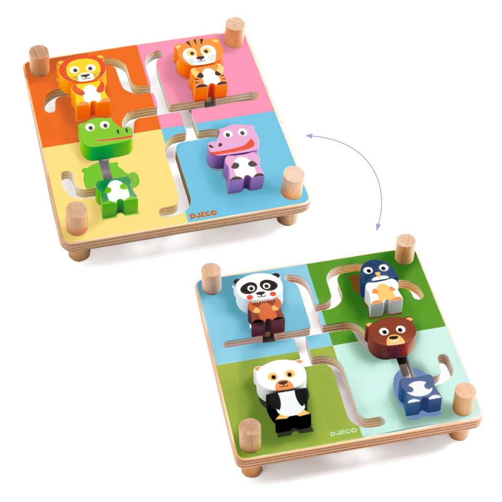 Mind a 4 állatfigurát két darabból kell kirakni úgy, hogy a megfelelő háttérhez a megfelelő labirintus útvonalon át odahúzza a gyermek a kirakó darabjait ahol egészet alkotnak. Miután a kirakótáblán a négy állatfigura egészben van, meg lehet fordítani az alaplapot és kezdeni újra a másik oldalon az állatfigurák kirakását. Újra és újra kirakhatóvá válnak a másik oldal figurái, mivel elmozdulnak a helyükből, miközben a hátoldalon helyre állnak. A színes sziluettek jelzik az alaplapon, hogy mi tartozik össze, hová helyezzék el a gyermekek a különböző állatokat. Végtelenített kirakó labirintussal. Ötletes!