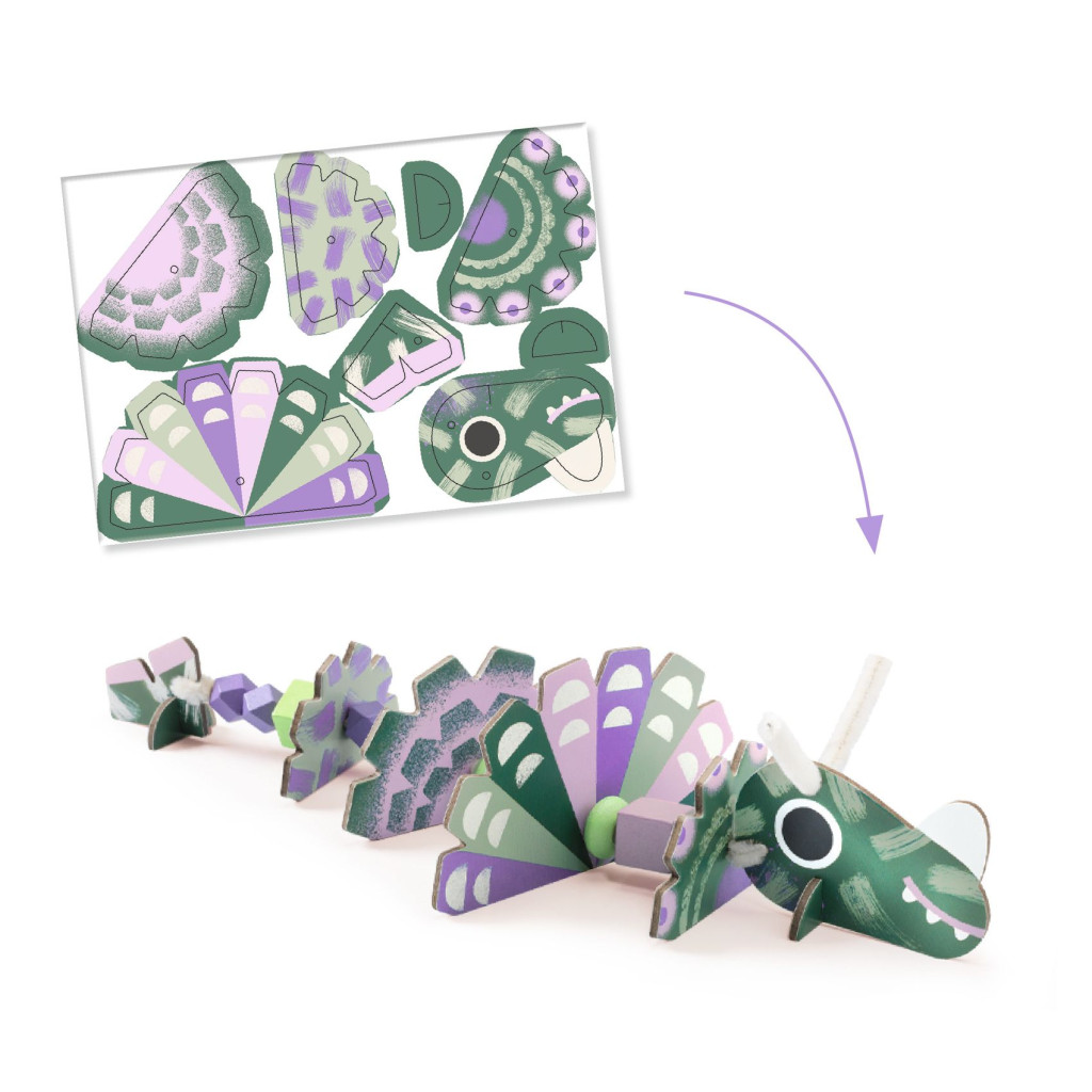 Egy különleges tevékenység, melynek során 3 kedves és egyben félelmetes dinót alkothatnak a gyerekek. A feladat során színes fagyöngyöket és előre kivágott karton elemeket fűznek fel zsenília drótra. A készletből egy lilás, egy kékes és egy narancssárgás színű dinoszaurusz készíthető, természetesen a színek keverhetőek. Az alkotó tevékenység közben fejlődik a kreativitás és a képzelet. A képes magyarázó füzetben találhatsz segítséget.