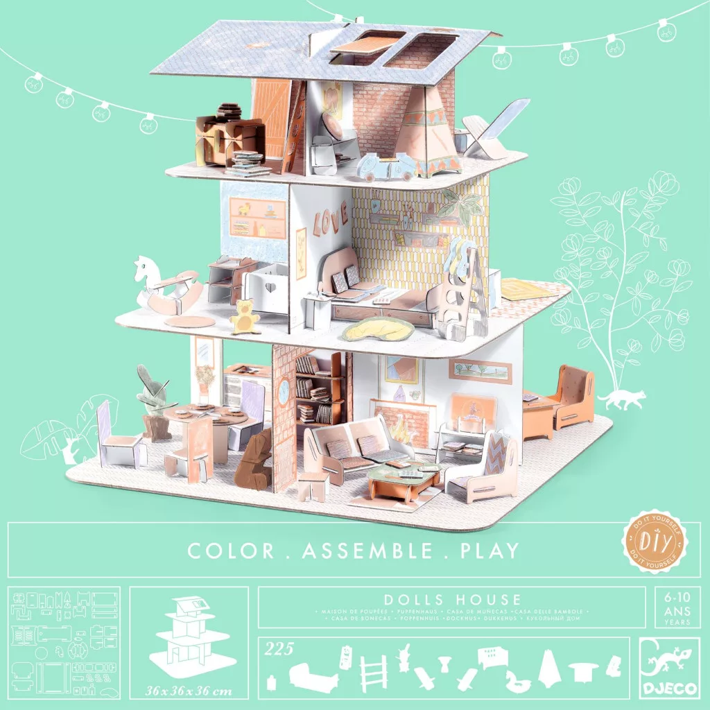 Kreatív készlet, amelyben rengeteg vastag kartondarabot kell kiszínezni és összerakni, hogy egy igazi babaházat készíthessünk, amelyet a benne található számos kiegészítővel és bútorral rendezhetünk be. Játék és kreatív elfoglaltság az órákig tartó alkotáshoz és játékhoz!