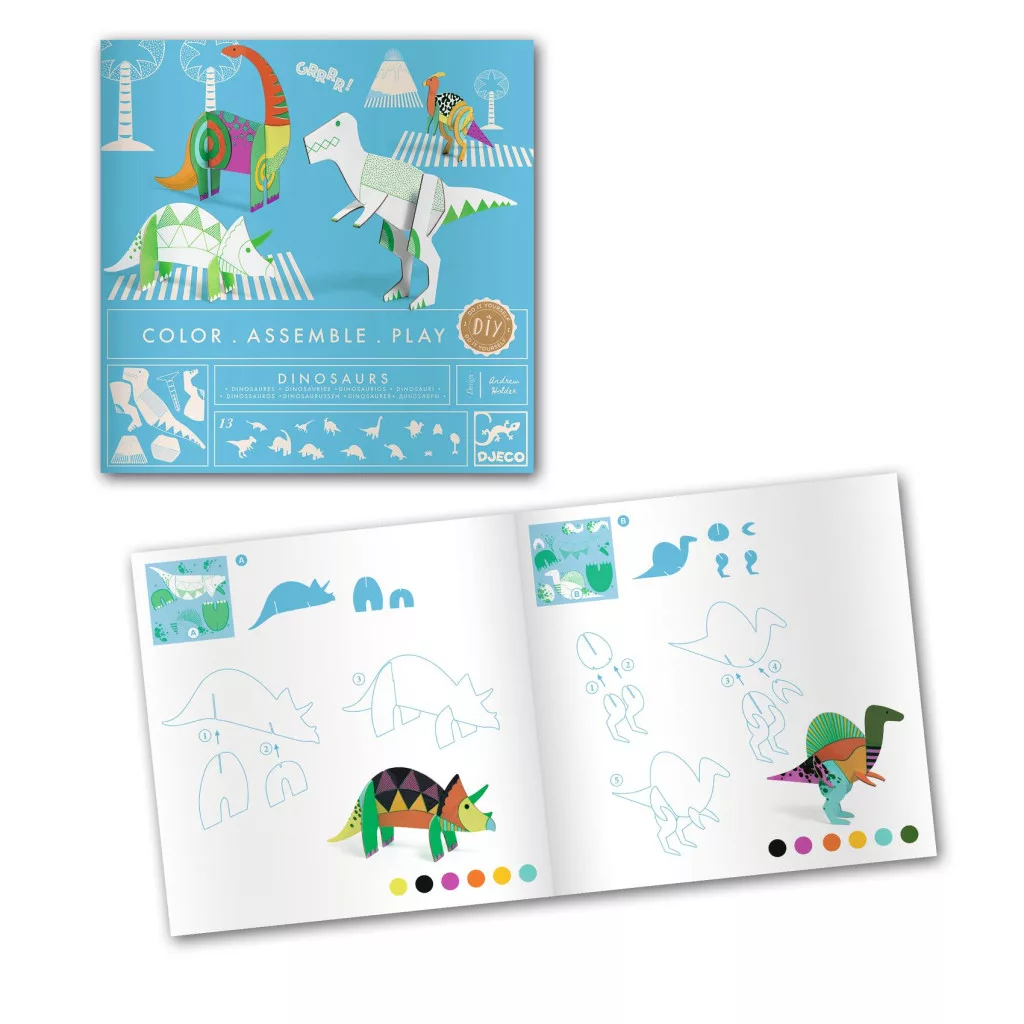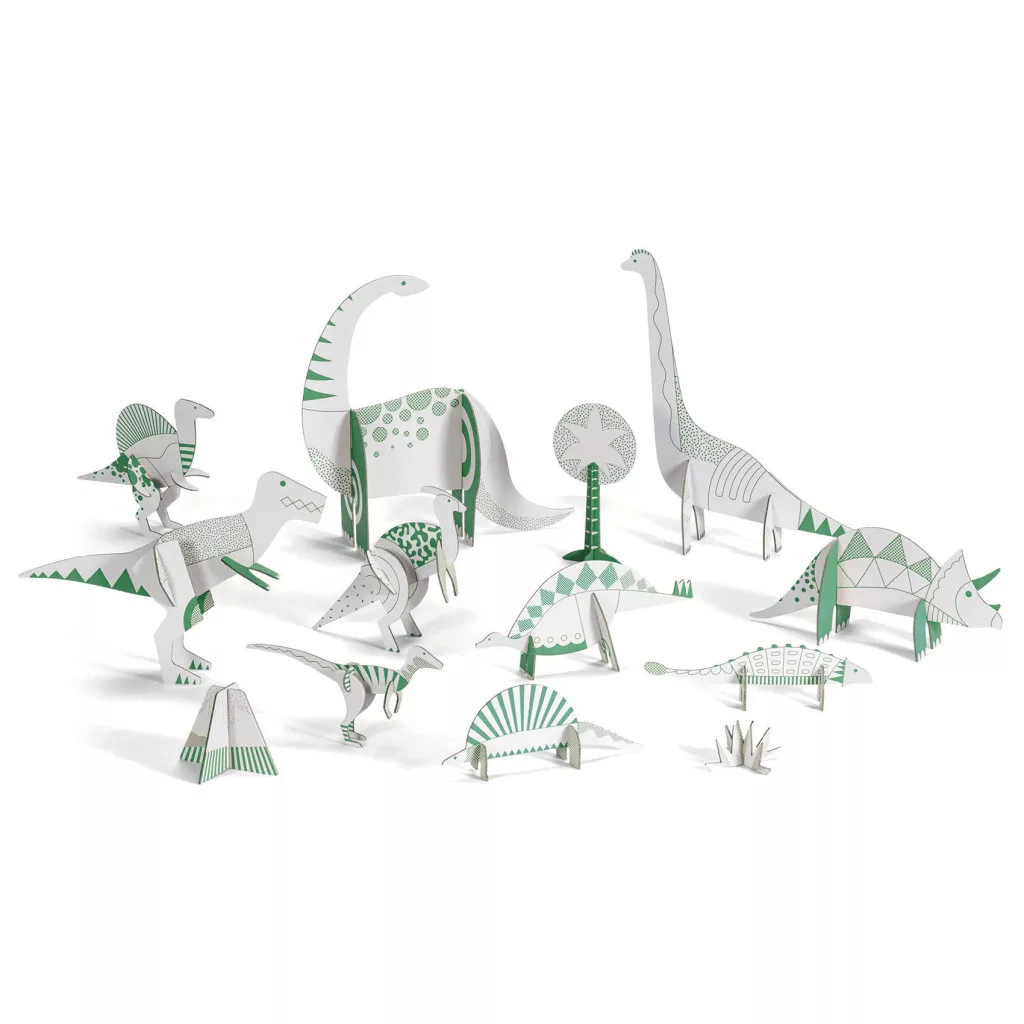 Kreatív készlet, melyben rengeteg kartondarabot lehet kiszínezni és összerakni, hogy az izgalmas dinóvilágot megalkossák az ezzel játszó gyermekek. A gyermek az alkotás után végre játszhat az összes létrehozott elemmel, és már indulhat is a mesés történetek kitalálása és elmondása!
