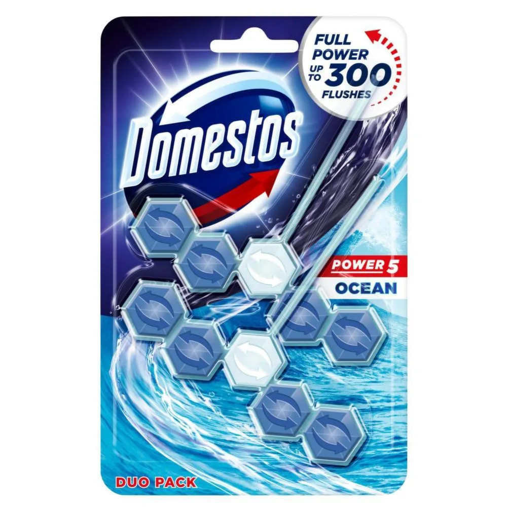 A Domestos Power5 WC frissítő blokk – Ocean illattal (2×55 g) hatékony WC-tisztító és illatosító blokk, amely minden öblítéssel friss, tengerparti aromát biztosít, miközben aktívan tisztítja a csészét és megelőzi a kellemetlen szagokat.