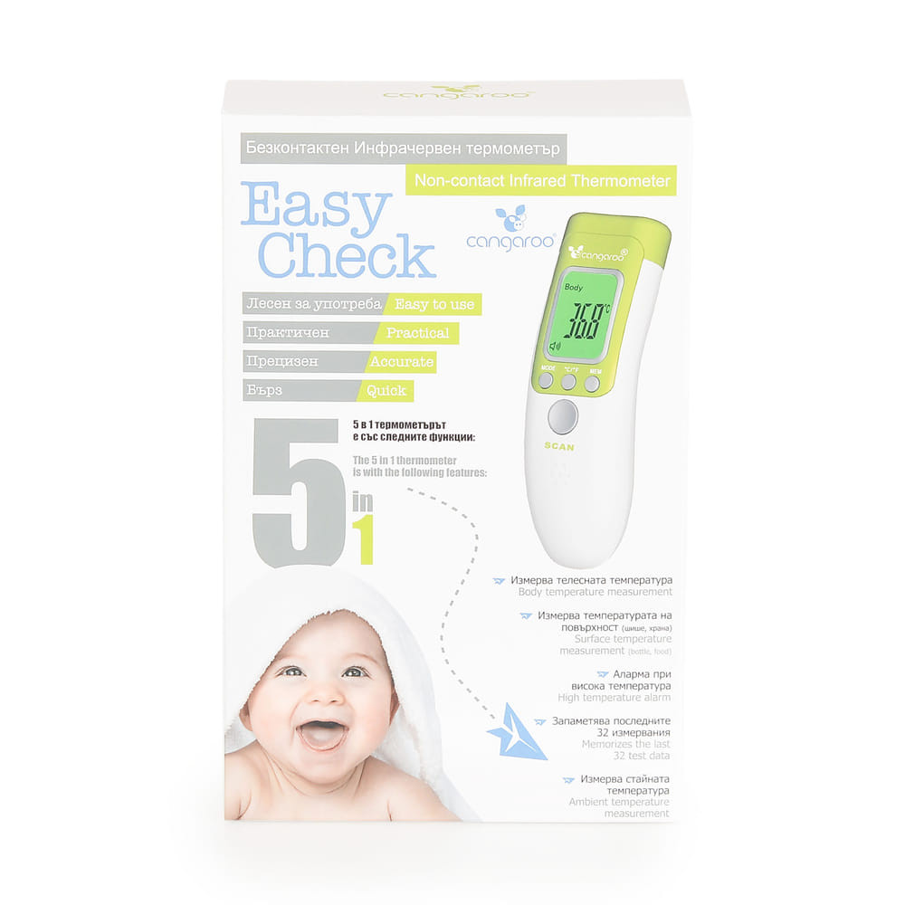 Az EASY CHECK infravörös hőmérő 5in1 egy csúcstechnológiai eszköz, amelyet a Cangaroo tervezett, hogy a mindennapi hőmérsékletmérés könnyebb és kényelmesebb legyen. Ez a hőmérő különféle felületek, beleértve az emberi test, az étel és a cumisüveg hőmérsékletének mérésére képes. Nem csak a hőmérsékletet méri, hanem riasztást is ad, ha a hőmérséklet túl magasra emelkedik. Nagyszerű funkciója, hogy a legutóbbi 32 mérési adatot is eltárolja, így könnyedén nyomon követhető a hőmérséklet változása. Ez a hőmérő a legmodernebb infravörös technológiát használja, ami lehetővé teszi a nem érintkező mérési módot, ezzel is minimalizálva a baktériumok terjedésének kockázatát. Így tehát nem csak praktikus, de higiénikus is.
