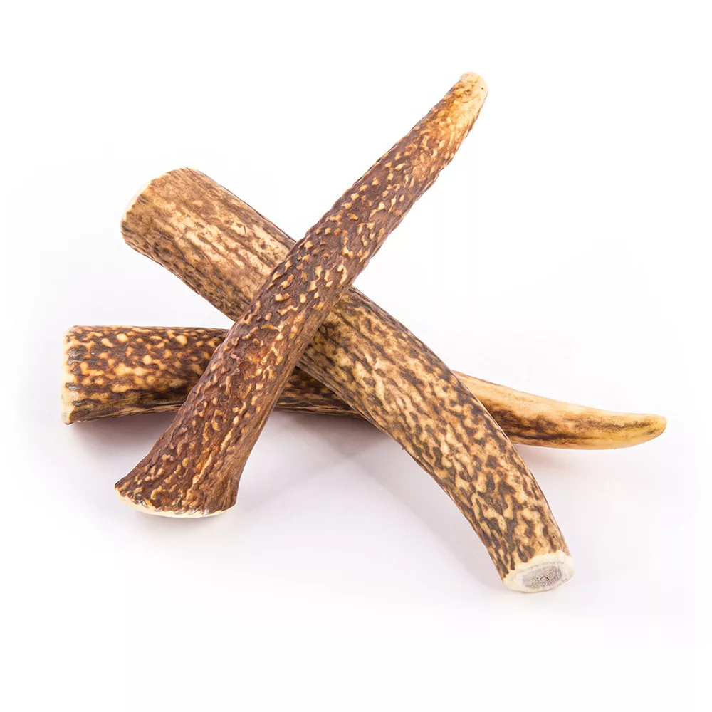- Hosszú távú tartósság. Az agancsok sokkal hosszabb ideig tartanak, mint a préselt keményítőből vagy nyers bőrből készült botok.