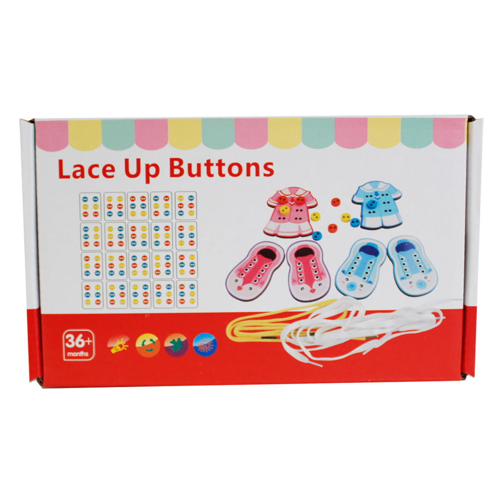 Fa cipőfűző és gombfelvarró oktató játék, 30x23 cm.