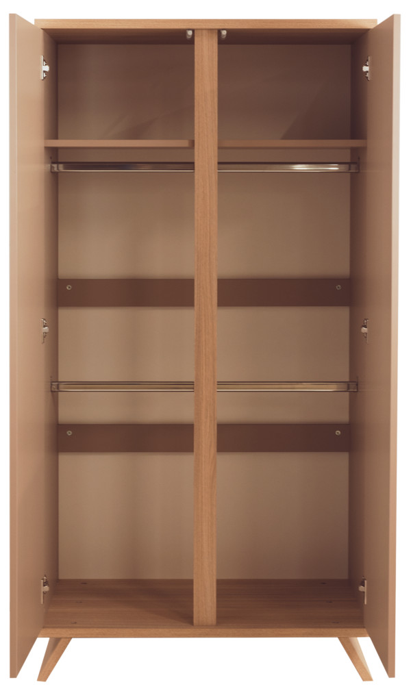A Sienna Cappuccino 2 osztású szekrény a babaszoba nélkülözhetetlen tároló bútoraként minden igényt kielégít. Praktikus belső akasztós kialakításának köszönhetően átláthatóan és könnyen kezelhetően tudod tárolni kisbabád ruháit. Továbbá a szekrényen belüli felső polc kialakítás a szekrény méreteinek kihasználását maximalizálja. Igény szerint további 3 db polccal is kiegészíthető.