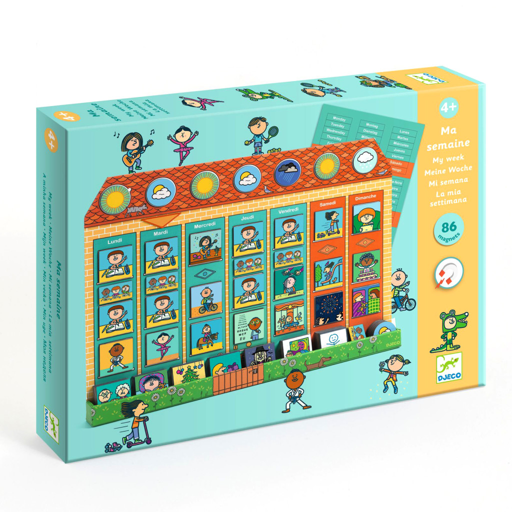 A Djeco heti tervező mágnestáblája megkönnyíti az időbeli tájékozódást.  Szórakoztató megközelítést kínál a múlt, jelen és jövő fogalmainak elsajátítására, segít a jelenben élő gyermeknek abban, hogy emlékezzen a múltbeli tevékenységekre, és előrelássa a jövőbeli teendőket. A ház alakú mágnestáblán először elnevezheti a hét napjait, majd választhat a különböző hétköznapi jeleneteket - sport- vagy művészeti tevékenységeket, rendszeres vagy kivételes eseményeket - ábrázoló (születésnap stb.), valamint az időjárást jellemző mágnesek közül, így kínálva végtelen lehetőséget  a hét megszervezésére. Az üres mágnesek lehetővé teszik a gyermek  számára, hogy saját illusztrációk rajzolásával személyre szabja heti tervezőjét.