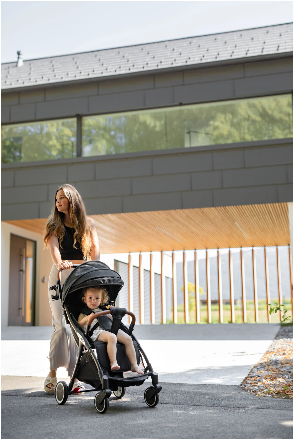 További kényelmet szolgál az állítható háttámla és a mellékelt palacktartó, valamint a babakocsi tárolására és hordozására szolgáló praktikus táska, fogantyúval / vállpánttal ellátva.