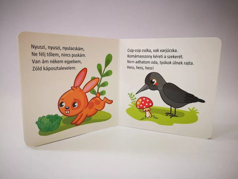 A Hová mész te kis nyulacska? egy kedves, rövid versikéket tartalmazó kartonkönyv, amely játékos formában vezeti be a legkisebbeket a mondókák világába. A nyúlfarknyi versek könnyen megjegyezhetők, így a közös felolvasás igazi élménnyé válik szülő és gyermek számára.