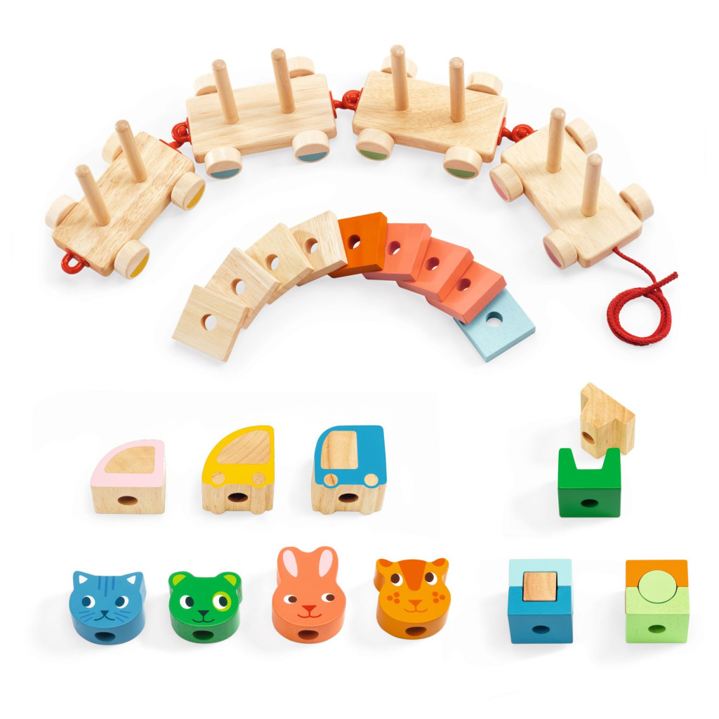 Több darabból álló, minőségi fából készült húzható és építhető játék.