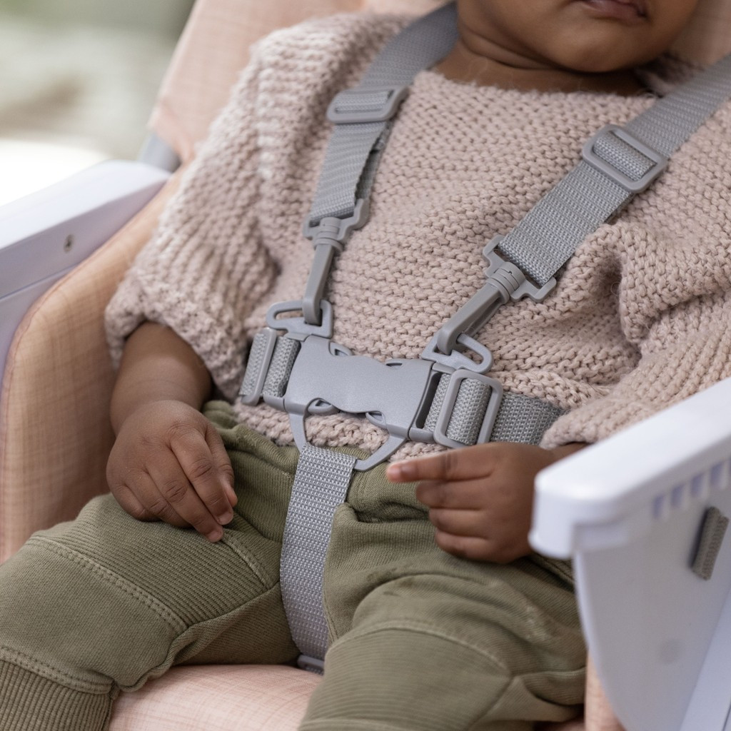 Ez az egyetlen olyan etetőszék, amely tányért kínál a baba önellátási képességeinek támogatására. Az egyedülálló, 3 részes Twist & Dine tányér biztonságosan rögzül a helyén, hogy a kicsik ne dobálják a padlóra, és az ételek egyszerű elkészítése érdekében mikrohullámú sütőben is használható. Ahogy a baba nő, a nagyméretű pult 3 pozícióba állítható. A pult a szék háttámlájához rögzíthető a tárolás érdekében. Az üléspárna gépben mosható. Az 5 pontos biztonsági övek gondoskodnak a gyermek biztonságáról.