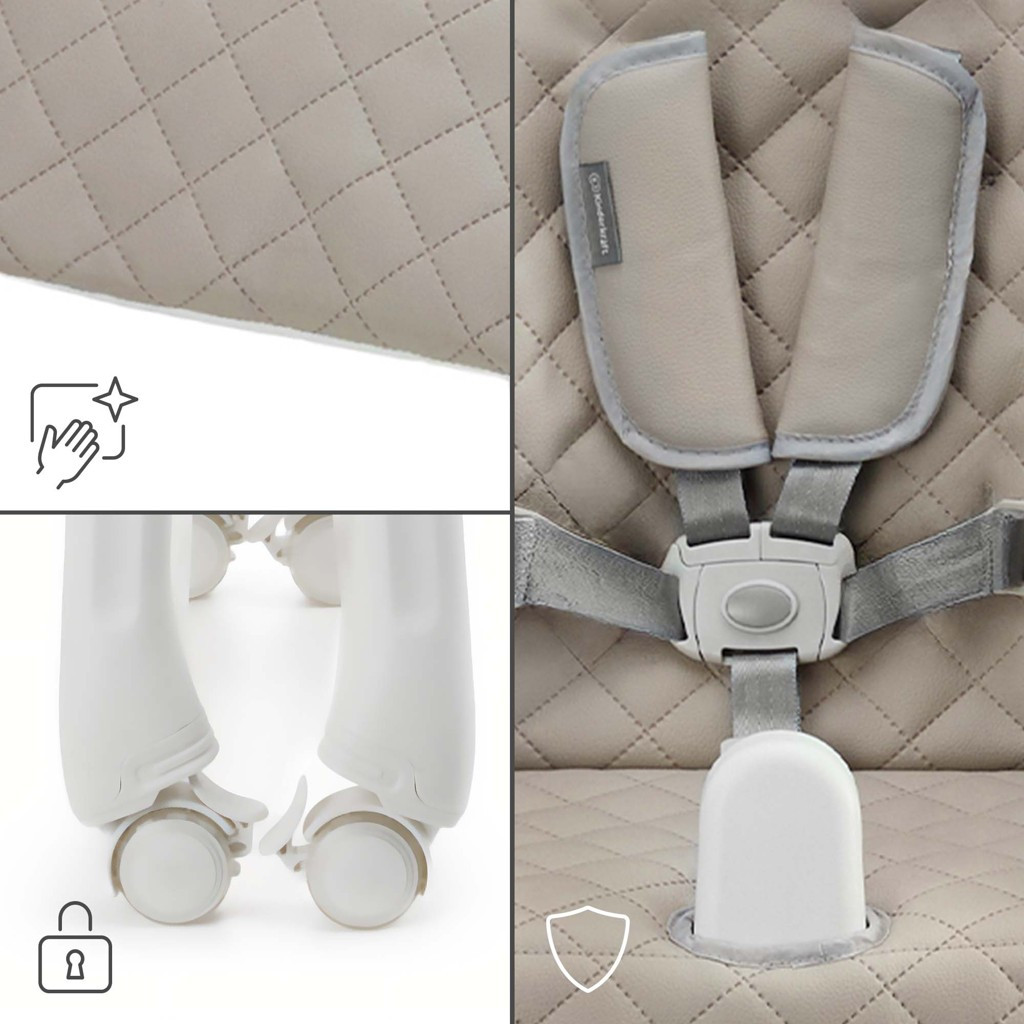 Az integrált kerekek fékekkel, 5 pontos biztonsági övek és a puha, könnyen tisztítható PU kárpitozás növelik a gyermek kényelmét és biztonságát. Összecsukva a szék rendkívül kompakt formát ölt, ami megkönnyíti a tárolását. Minimális helyet foglal, így könnyen elfér egy sarokban vagy szekrényben.