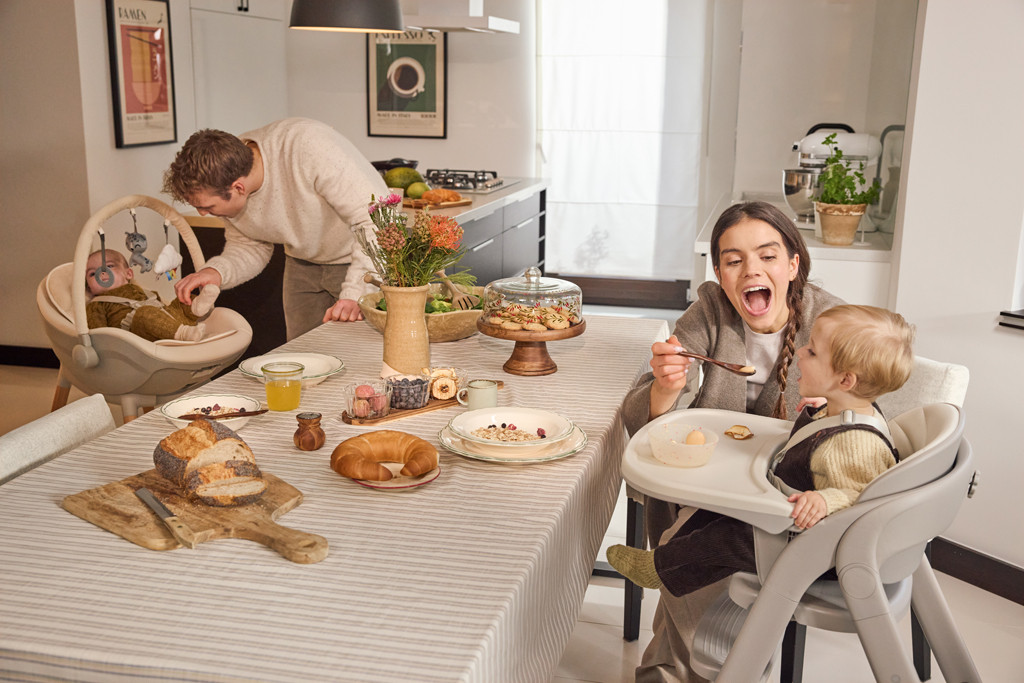 A FINI UP egyesíti a legkisebbek számára készült hintaszéket, az etetőszéket és a kényelmes ülést a nagyobb gyermekek számára – egy egységes dizájnban, amely illeszkedik az otthonba.