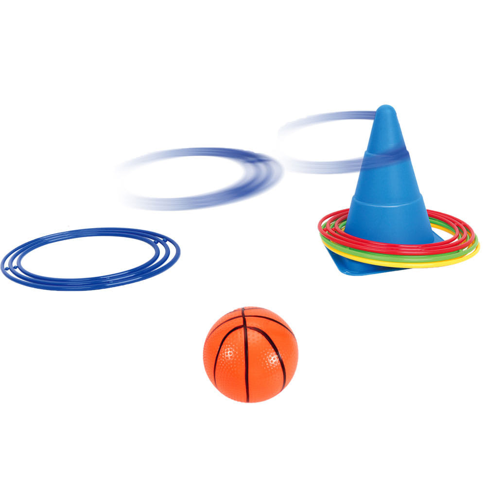Színes karikadobáló készlet labdával és pumpával, 16x16 cm.