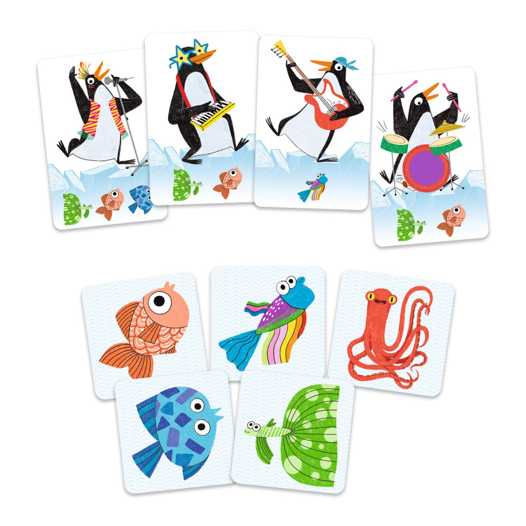 Jön a Rock Banda Fesztivál! Ha neked osztották a magányos gitáros lapját, te legyél a leggyorsabb, hogy meggyőzd a legjobb zenészeket, (játékos társakat) hogy csatlakozzanak hozzád, alapítsatok együtt egy zenekart! Dobos, billentyűs, énekes és basszusgitáros játszik a RockPingvin zenekarban. Melyik tag mit szeret? Mindegyik halevő! Keverd jól a lapokat, ne légy többé magányos Pingvin!