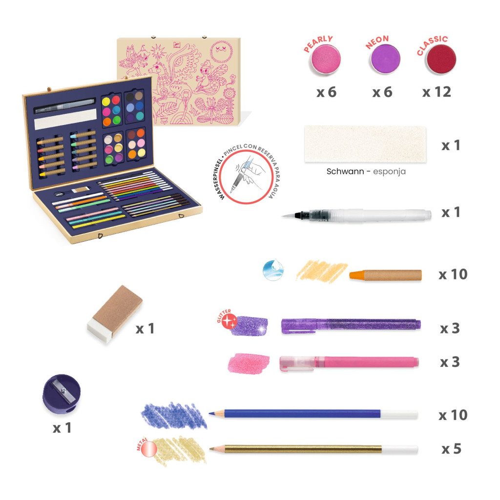 Ez a kreatív készlet minőségi felszerelést tartalmaz és lehetőséget kínál a kezdő művészeknek, hogy megismerjék a különböző festési és alkotási technikákat. A dobozban az egyik oldalt az akvarellnek és a festészetnek szentelték, a másikat a rajznak. A csillámos, neonos, gyöngyszínű vagy metálos színek lehetővé teszik a gyermek számára, hogy feldobja alkotásait. A doboz külsejét színezhető  kép díszíti, hogy személyre szabható legyen a felszerelést tároló doboz kinézete is.
