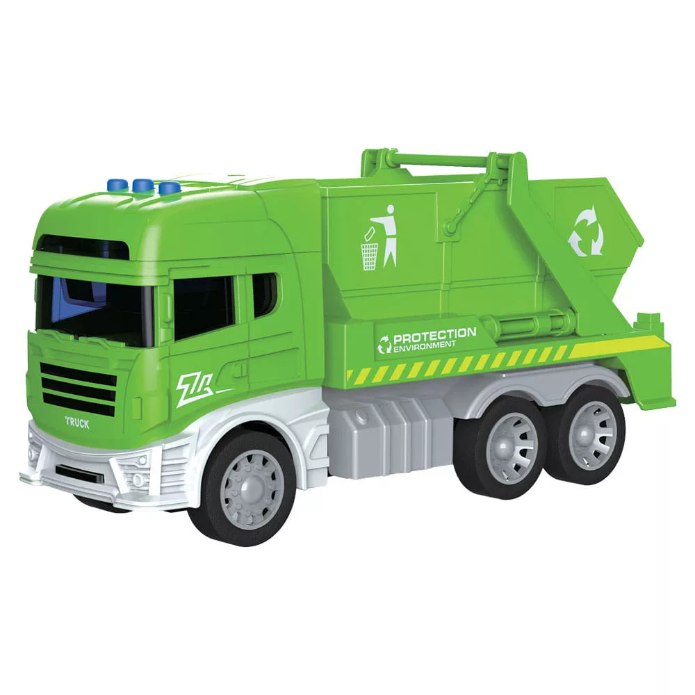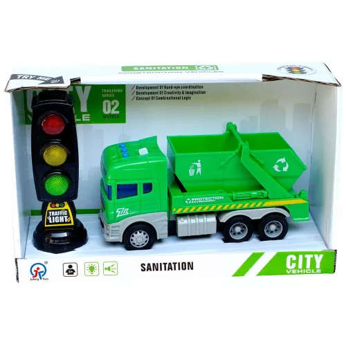 Konténeres kukásautó hang- és fényhatásokkal, közlekedési játék.