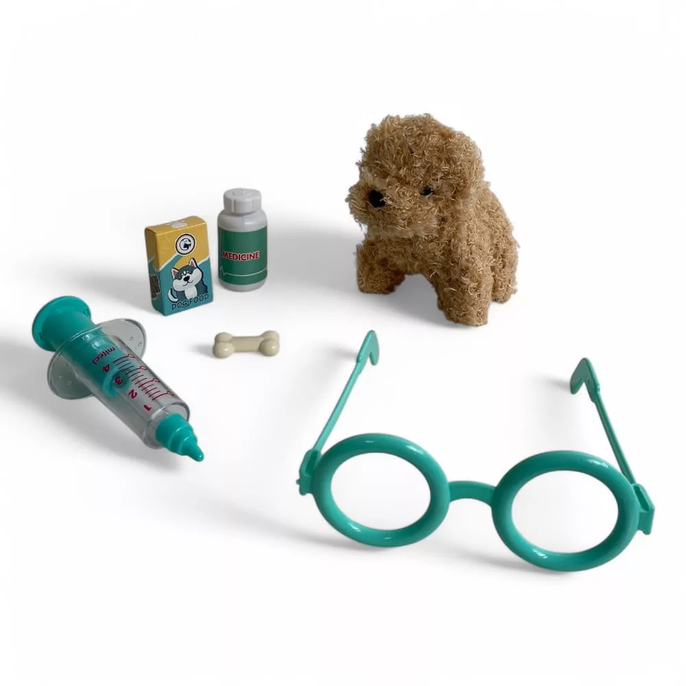 Plüss kutya orvosi készlettel, 25x23 cm, gyerekeknek.