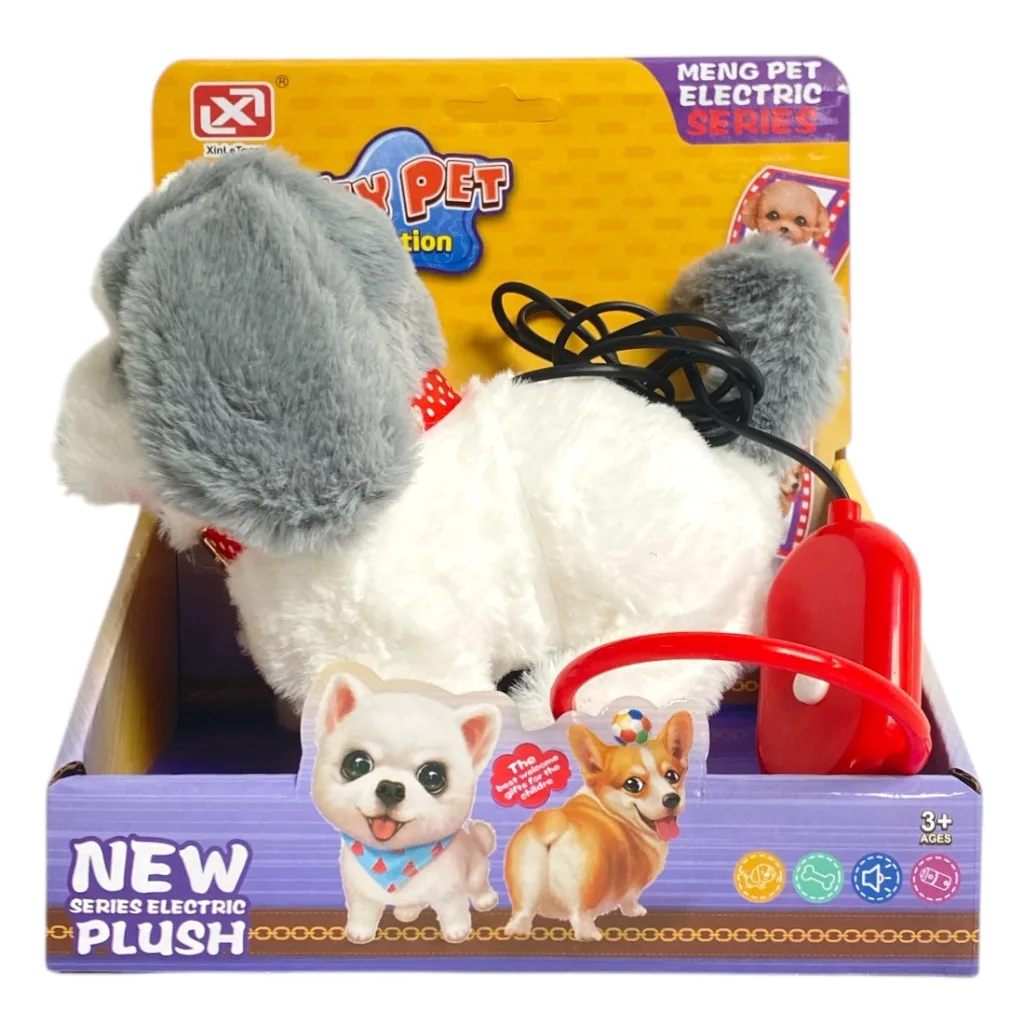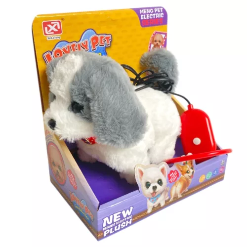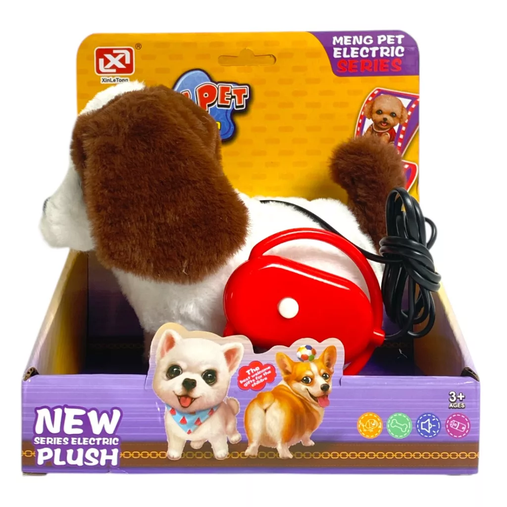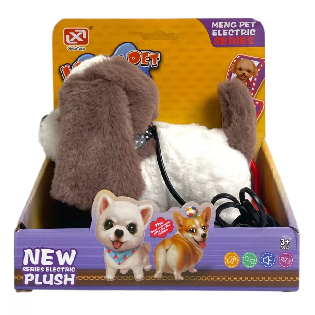 Kutya, plüss, el., jön-megy, ugat, pórázzal, 3 szín, 18x20 cm dob.