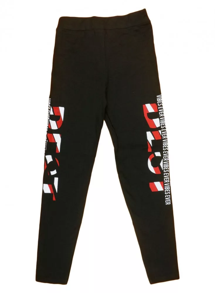 Egyszínű fekete hosszú leggings, gumis derékkal, oldalán piros-fehér felirattal