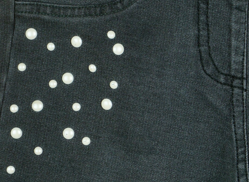 Elején szakadt hatású, gyöngyökkel dekorált. Állítható derekú.