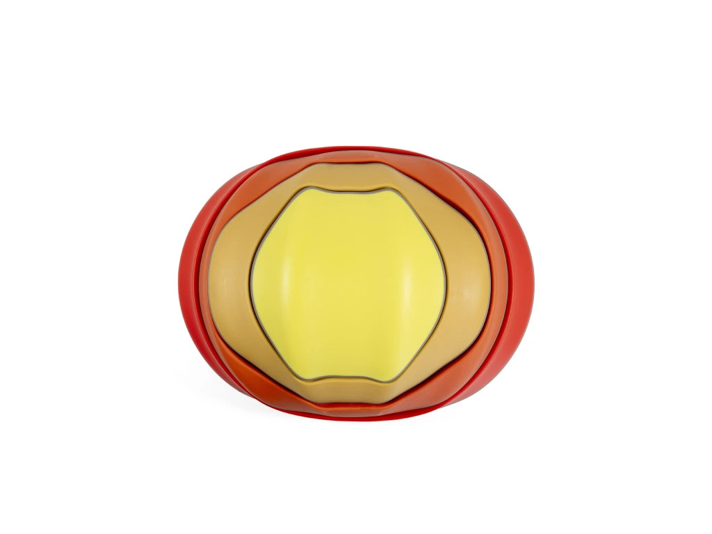 A színes kialakítás (piros, korall, okker, sárga) vizuálisan is motiváló. Az elemek egymásba illeszthetők, legnagyobbtól a legkisebbig összeállíthatók.