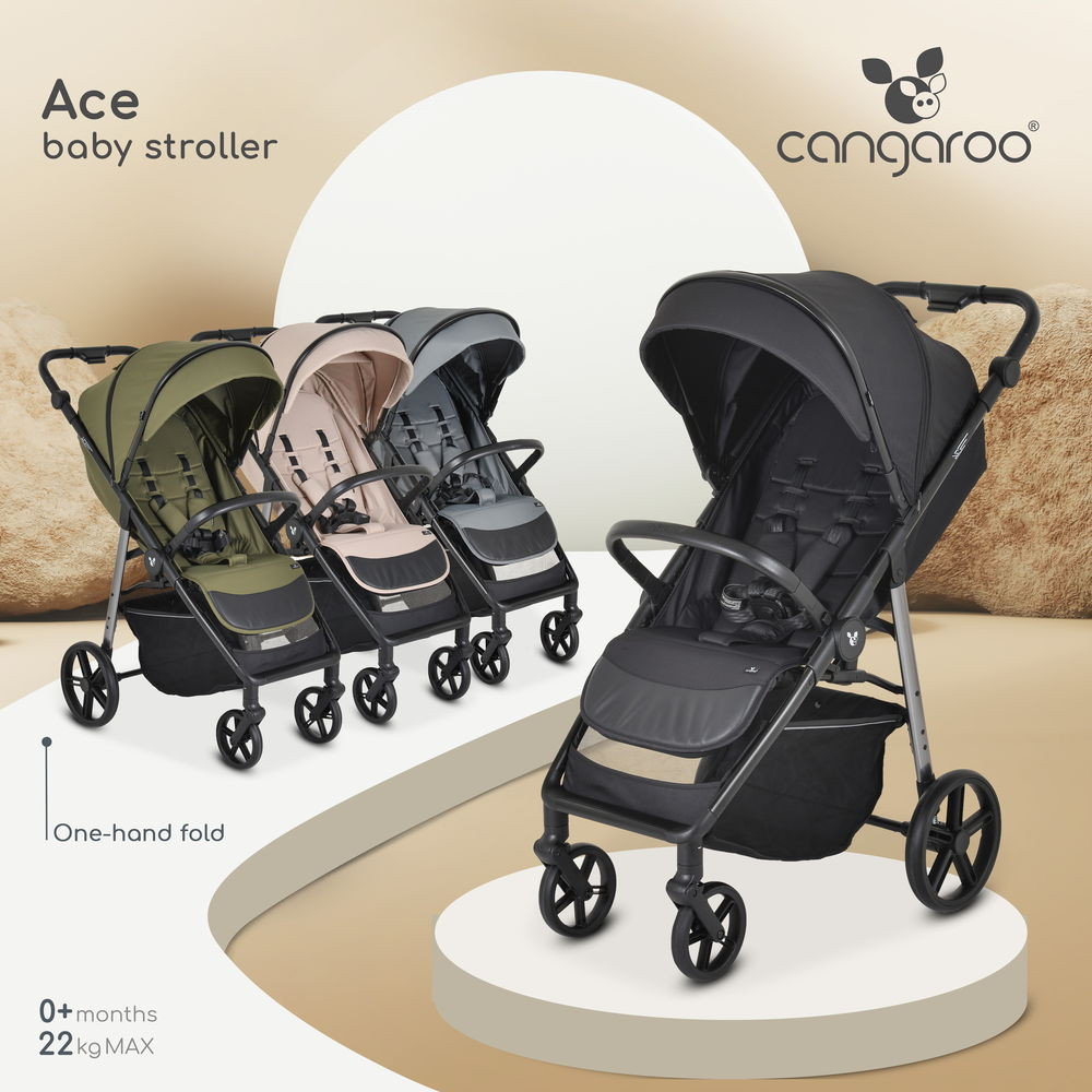 Könnyű, kompakt és könnyen összecsukható - az Ace babakocsi, a Cangaroo minden részletre odafigyelve készült, hogy maximális kényelmet biztosítson a gyermeknek és a szülőknek egyaránt. A kiváló minőségű gumiabroncsoknak és a teljes összkerékfelfüggesztésnek köszönhetően ez a babakocsi városi utcákon és terepen egyaránt használható, így bárhol sima és stabil utazást garantál.