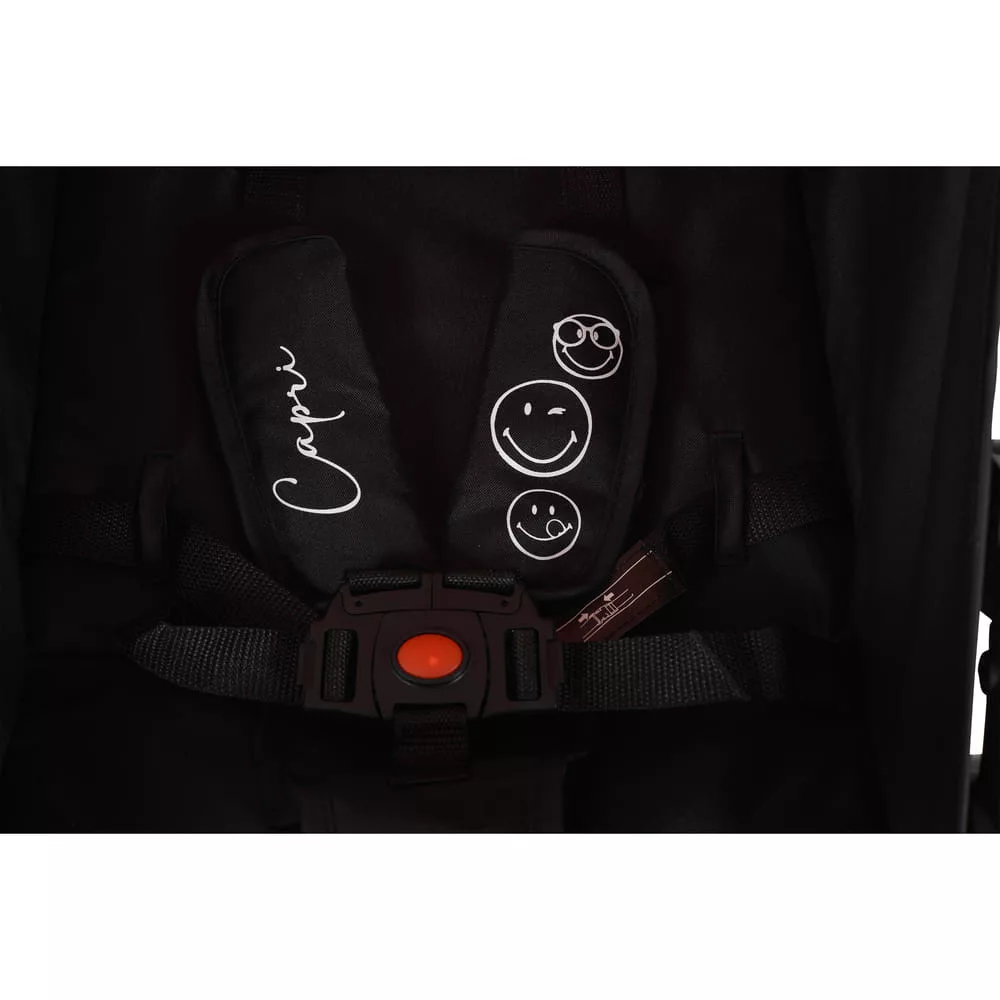Megfelelő 6 hónapos és 36 hónapos korú vagy legfeljebb 15 kg súlyú gyermekek számára. Az ötpontos biztonsági öv biztonságot nyújt a gyermeknek. Az háttámla, lábtartó és napernyő pozíciója állítható. Az első kerék 360°-ban forog. Könnyű és kompakt összecsukható. Csak 5,1 kg súlyú.