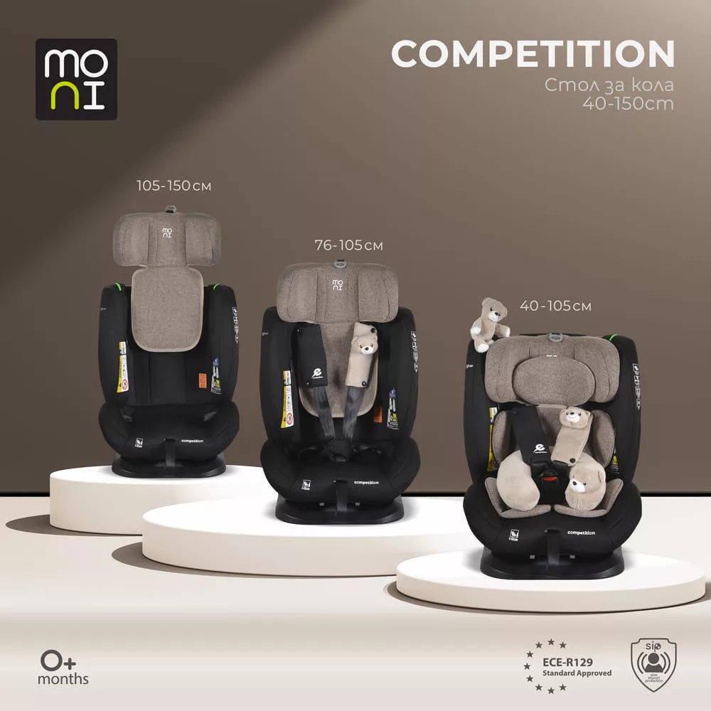 Competition by Moni egy innovatív autósülés, amely a legmagasabb szintű védelmet és kényelmet biztosítja a gyermek számára – az első hónapoktól kezdve egészen addig, amíg az ülést használja. A modell az új európai R129/i-Size szabvány szerint jóváhagyott, és két külön tanúsítvánnyal rendelkezik – a 40–105 cm és a 105–150 cm korcsoportok számára.