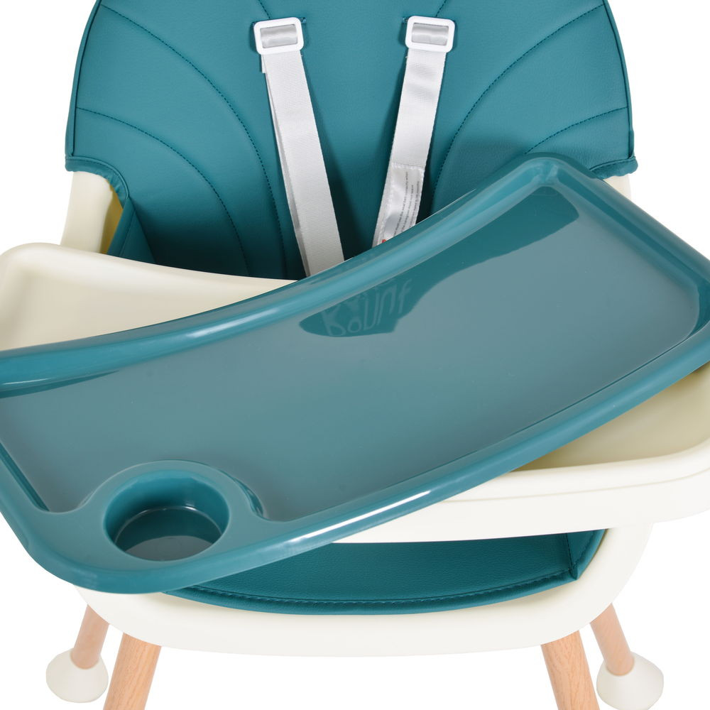 A Donut etetőszék 2 az 1-ben klasszikus, letisztult dizájnnal rendelkezik, 2 rétegű etetőtálcával, pohártartóval és 2 pozícióban állítható, 5 pontos rögzítő rendszerrel, lábtartóval. A lábak fából készült lenyomattal, a párna pedig PU bőrből készült.