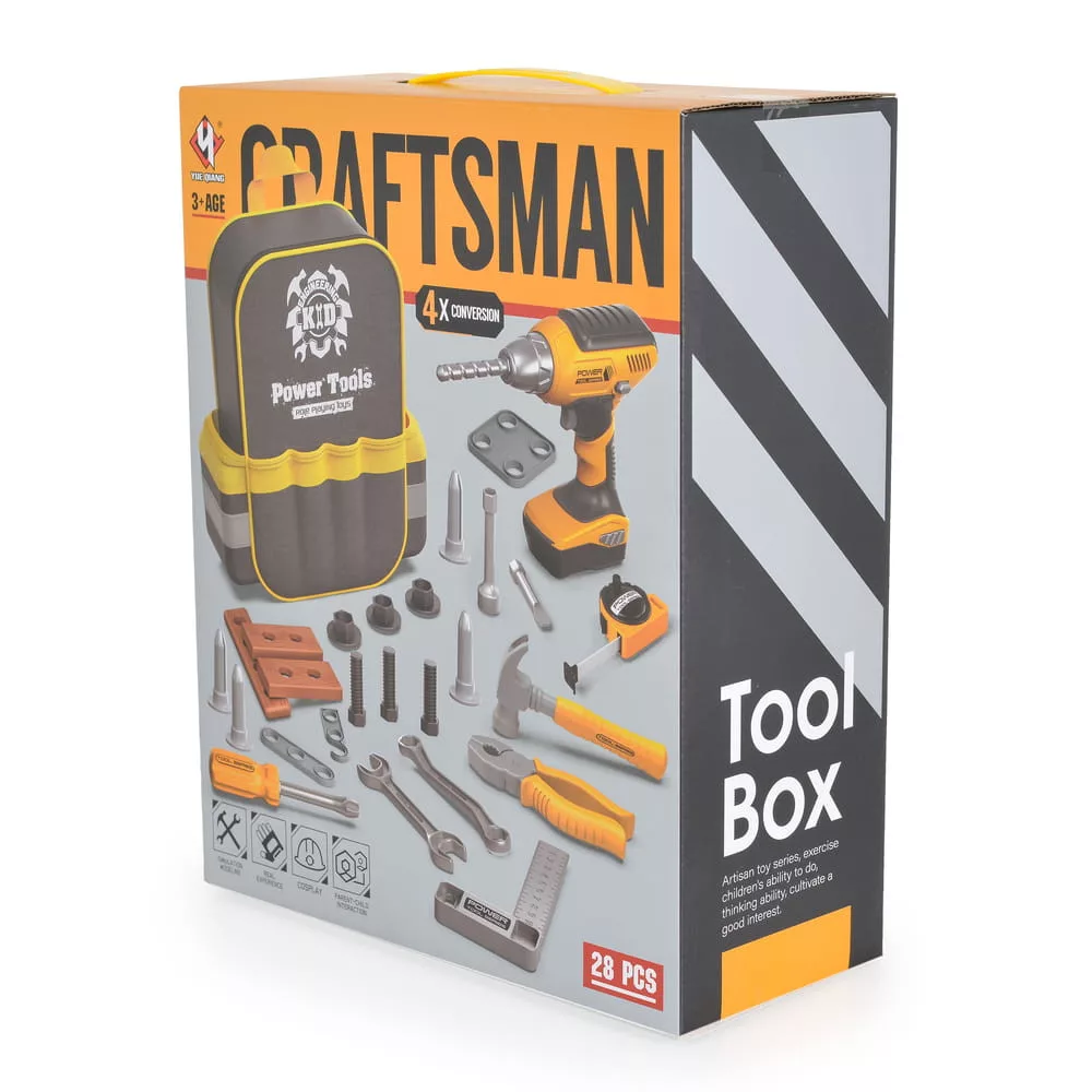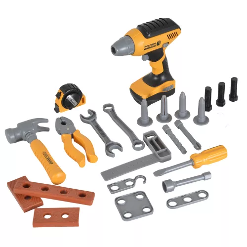 Valósághű készlet 28 alkatrésszel. A készlet tartalmaz egy fúrót 4 cserélhető fúrószárral, egy mérőszalagot, egy kalapácsot és sok más szerszámot. Egy praktikus hátizsák is található a szállításhoz.