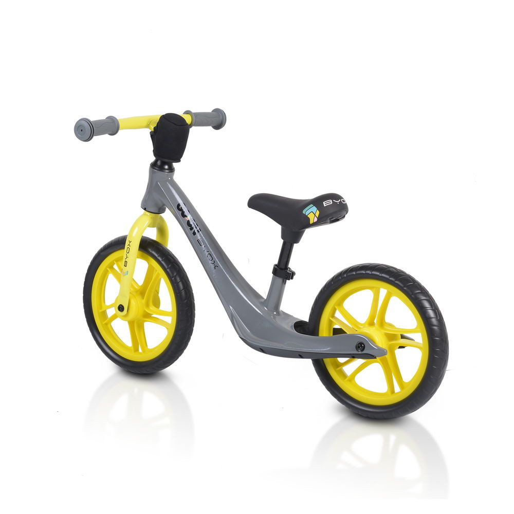 Egészségre ártalmatlan vízálló festékkel bevonva és biztonságos TPE markolatokkal, 12 hüvelykes habosított kerekekkel, állítható nyereggel 32cm-41cm. A kerekek nem fújhatóak, tömör PU.