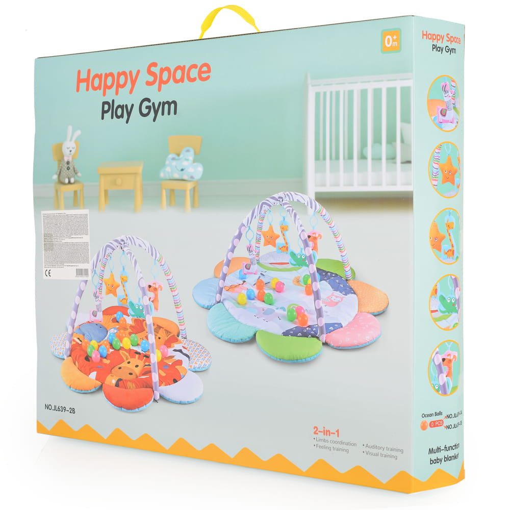 A termék 0 hónaposnál idősebb gyermekek számára készült. Ez egy 3 játékpozícióval - háton, pocakosan és ülve - rendelkező játéktorna, amely számos puha játékot, 20 játéklabdát, párnát és levehető játékíveket tartalmaz. A játszószőnyeg nem mérgező anyagokból készült, biztonságos a gyermekek egészsége szempontjából. Mind a 4 oldala zárható. Ez a termék serkenti a gyermek intellektusát, a kéz- és lábmozgást, a különböző formák és színek felismerését. 100% poliészter, PP.