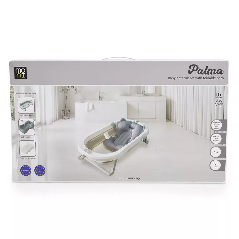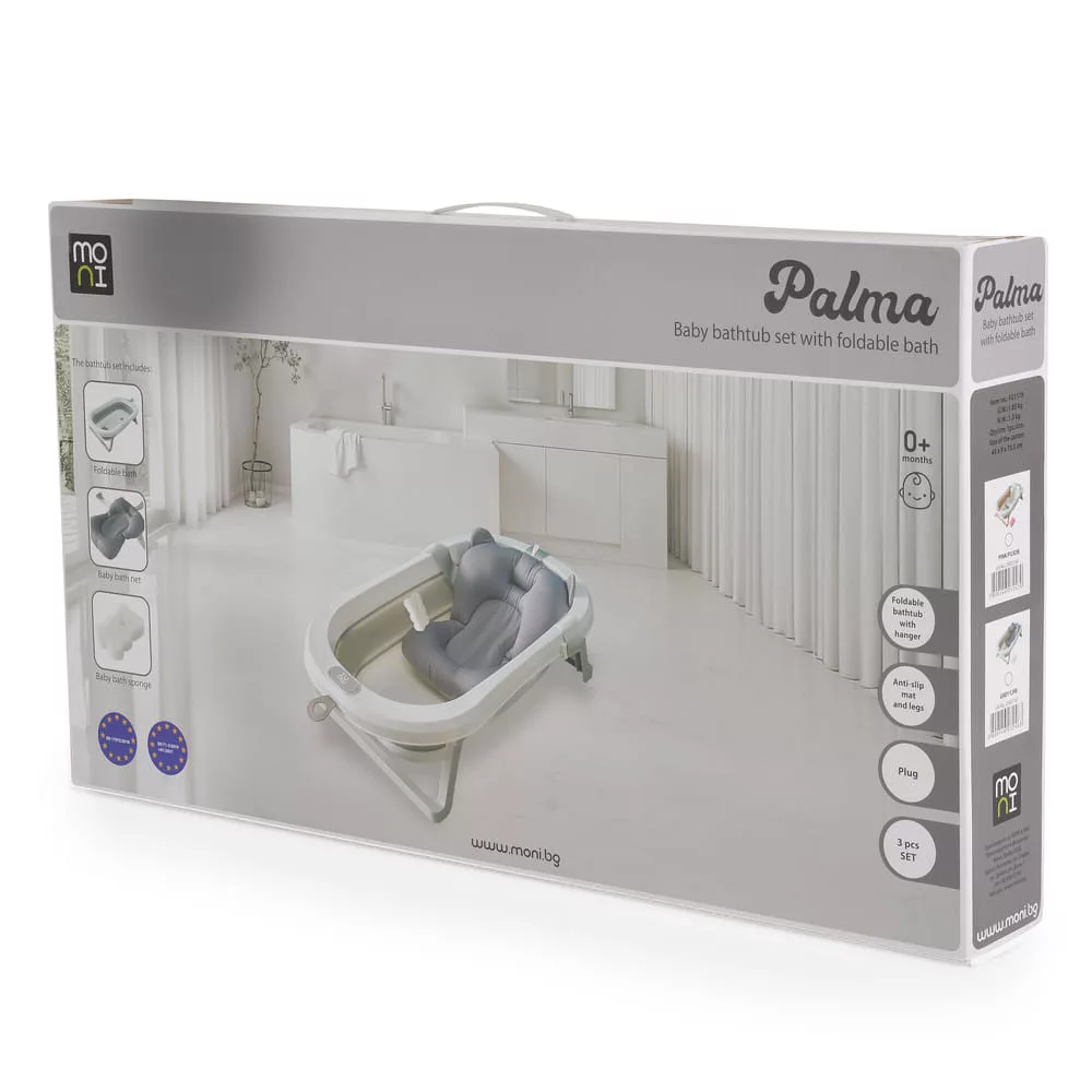 3 részes fürdőszett összecsukható káddal Palma, Moni - kényelem és komfort az első naptól kezdve! Tegye a fürdőzést élvezetes élménnyé ezzel a praktikus és stílusos, kifejezetten a kicsik számára tervezett szettel. Az újszülöttek számára 0+ hónapos kortól alkalmas, a funkcionalitást, a biztonságot és a kényelmet ötvözi egyben. A készlet a következőket tartalmazza: egy összecsukható fürdőkád 75*35*18,5 cm-es méretben - könnyen tárolható és helytakarékos; egy puha, 43x33 cm-es fürdőszőnyeg - a fürdetés közbeni gyengéd alátámasztásért; egy szivacs - alkalmas a baba érzékeny bőrére. Legfontosabb előnyök: - Összecsukható kialakítás - kompakt, ideális kis helyiségekbe. - Falra akasztható lehetőség - kényelmes és praktikus tárolás. - Csúszásgátló elemek a lábakon - a stabilitás és a biztonság érdekében. - Lefolyónyílás dugóval - a kád könnyű és gyors kiürítése. - Csúszásgátló talp a kádon - a nagyobb biztonság érdekében. - Kiváló minőségű, egészségre ártalmatlan anyagok. A Palma, Moni készletet a baba és a szülők szem előtt tartásával tervezték - a nagyobb biztonság, kényelem és nyugalom érdekében. FIGYELEM! A segédeszköz (kádszőnyeg) nem biztonsági eszköz. Akkor hagyja abba a fürdőalátét használatát, amikor a gyermek már képes felülni más segítsége nélkül.