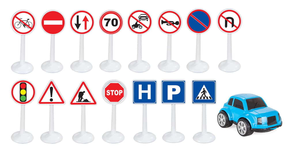 16 miniatűr közlekedési tábla.