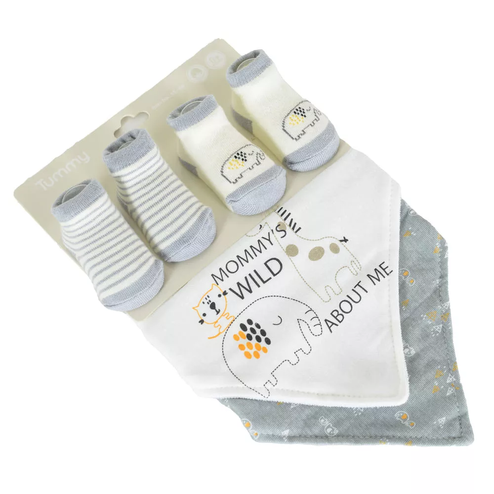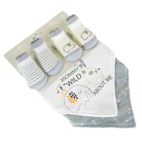 Ez az imádnivaló, újszülötteknek (0 m+) alkalmas szett 2 nyálkendőt és 2 pár zoknit tartalmaz.