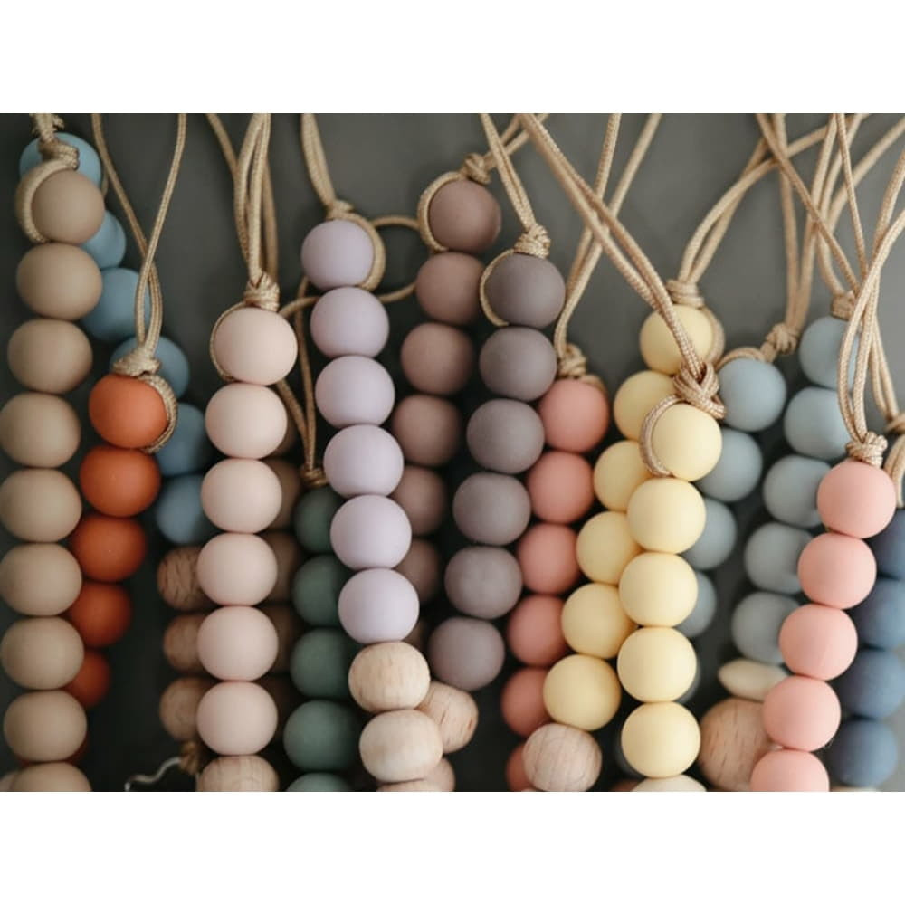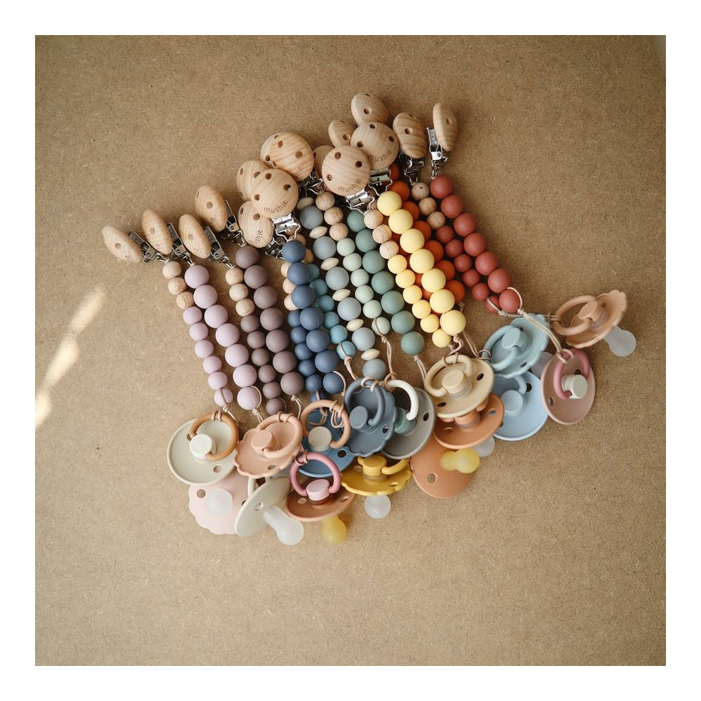 Amerikai anyukák és apukák kézzel készült terméke kezeletlen fából és 100% élelmiszeripari szilikonból készült gyöngyökből. A rögzítést segítő csat ólommentes.