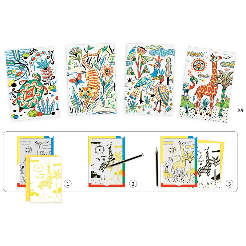 Egzotikus állatfigurás grafikák másolása és színezése, kreatív készlet a Djeco-tól.