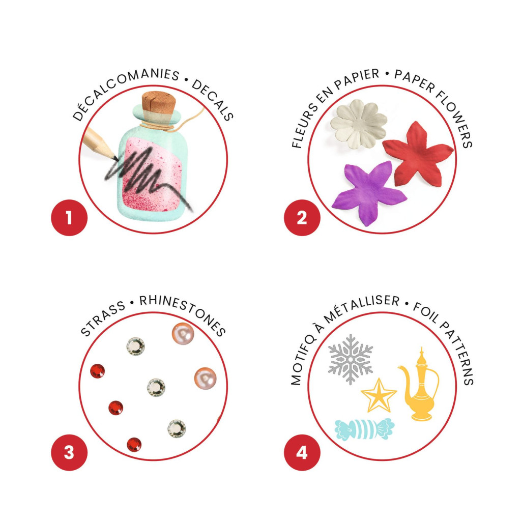 A készlet mind a 4 illusztrációja (4 jelenet a Diótörőből) négy különböző tevékenységet egyesít, lehetővé téve a gyermekek számára, hogy szórakozás közben fedezzenek fel különféle művészi technikákat. A tevékenységeket úgy tervezték, hogy könnyen végrehajthatóak legyenek a garantált siker érdekében. Minden kép matricákkal, papírvirágokkal, öntapadó strasszokkal és fóliával díszíthető. Ez a négyféle lehetőség együtt négyszer csodálatosabb eredményt ígér!