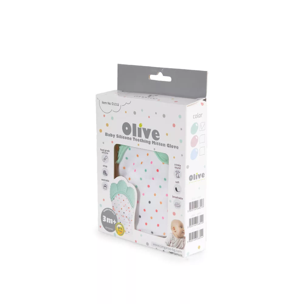 Az OLIVE Szilikon rágóka fogzáshoz menta, egy csecsemőknek tervezett, puha és légáteresztő anyagból készült kesztyű, amelyet a Cangaroo márka kínál. Ez a termék gyengéden enyhíti a baba ínyének fogzási kellemetlenségeit. A kesztyűben található szilikonrésznek köszönhetően a baba biztonságosan rágódhat, ugyanis a szilikon nem tartalmaz BPA-t. Menta színben kapható, ami vidám és friss hatást kölcsönöz a terméknek. Az online vásárlás kényelmét kínálja többek között az Ozone.bg, eMAG és Baby.bg webáruházakban.